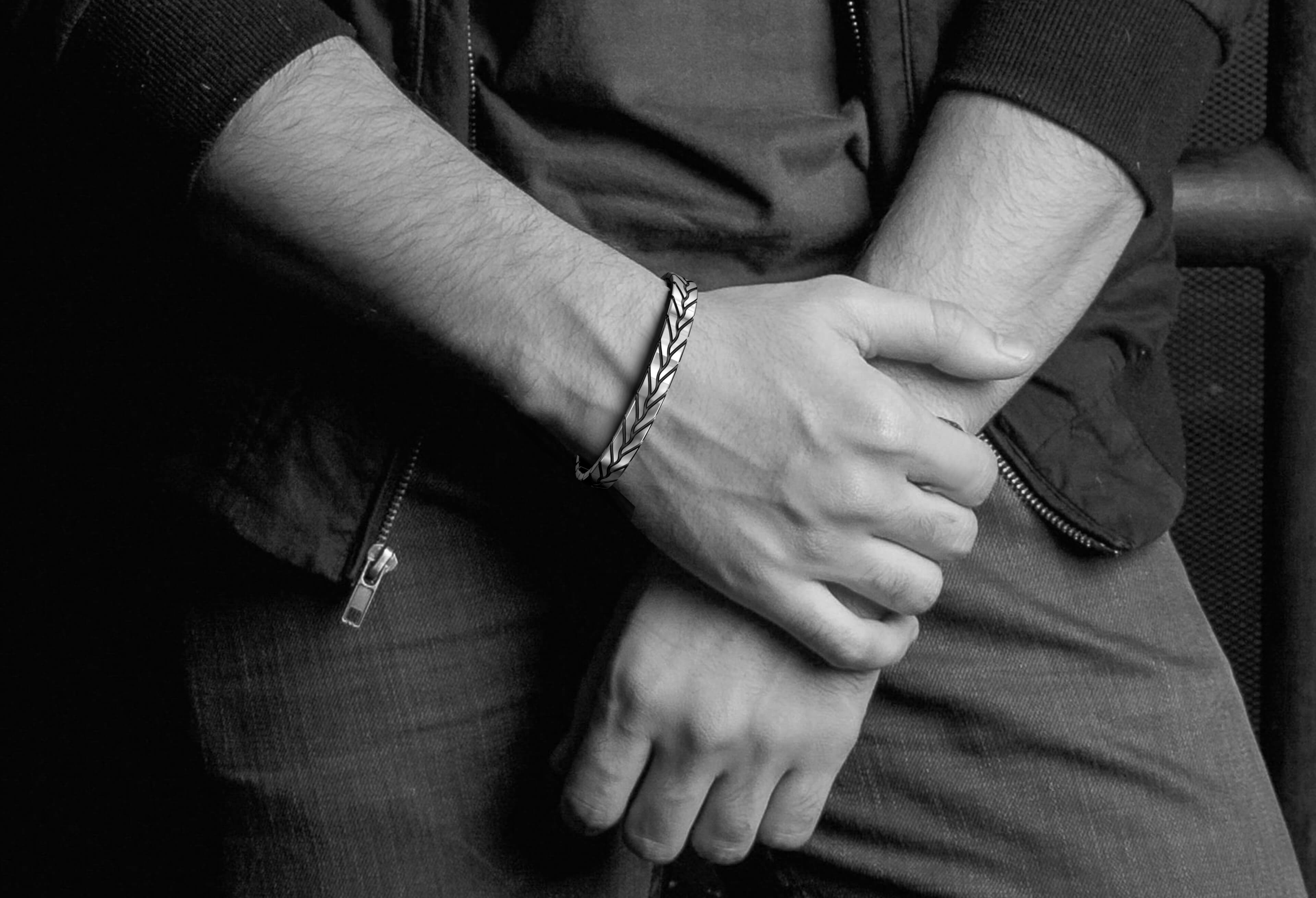 The snake-scale print makes this piece of jewel as trending as it could be in the crowds of working millennials. The hype is all understood as we watch this snake-skin Kada closely. It's everything the men of today need to make an impression. Its anti-tarnish coating protects the newness and makes it last forever while the white rhodium keeps its promise to never let it turn dull. It's a 925 hallmarked jewelry, simplistic, sober, and makes a man reflect into whichever room he enters.