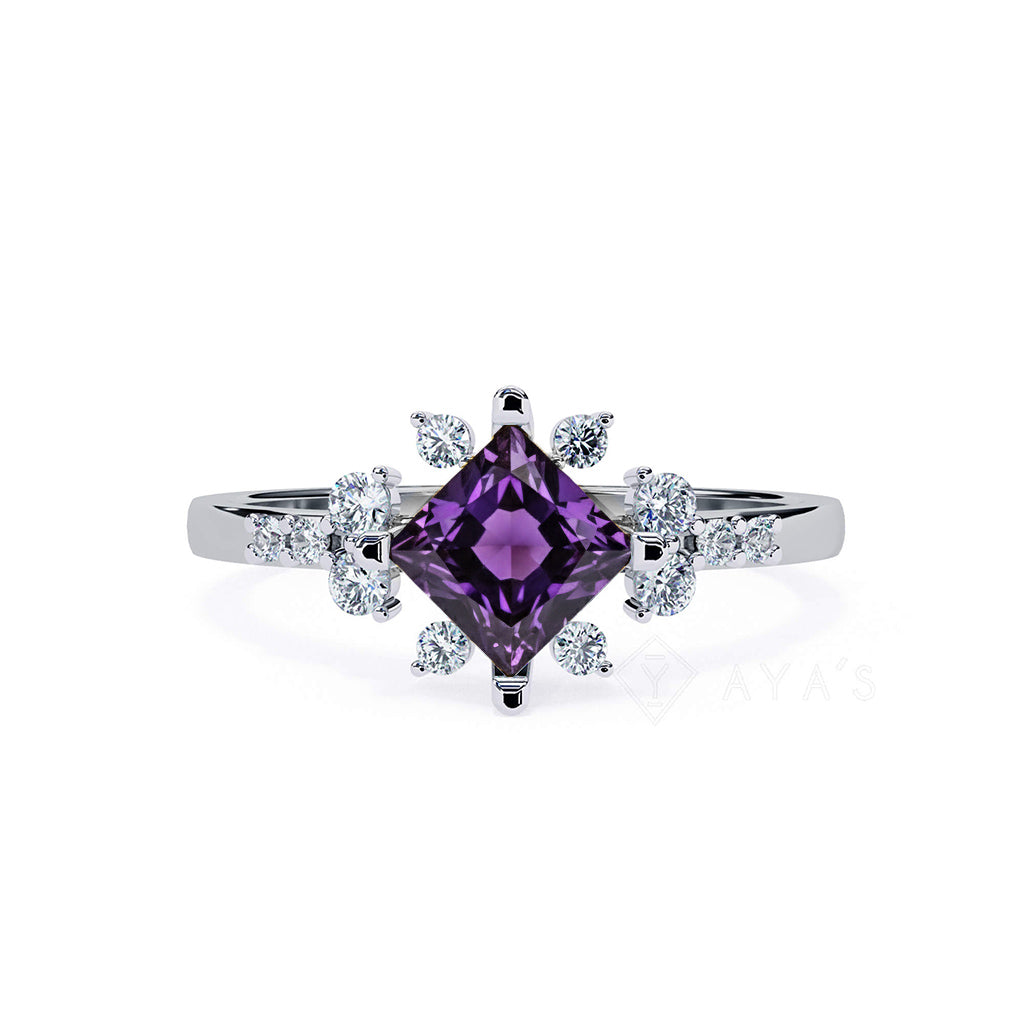 - Stone: Princess-cut Amethyst with round and marquise-cut accents