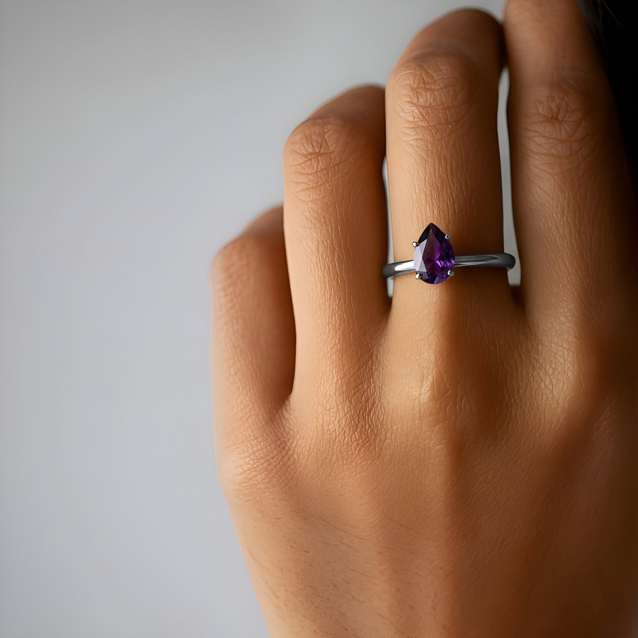 Silver Veloura Drop Amethyst Natural Gemstone Solitaire Ring – 925 Sterling Silver for Women