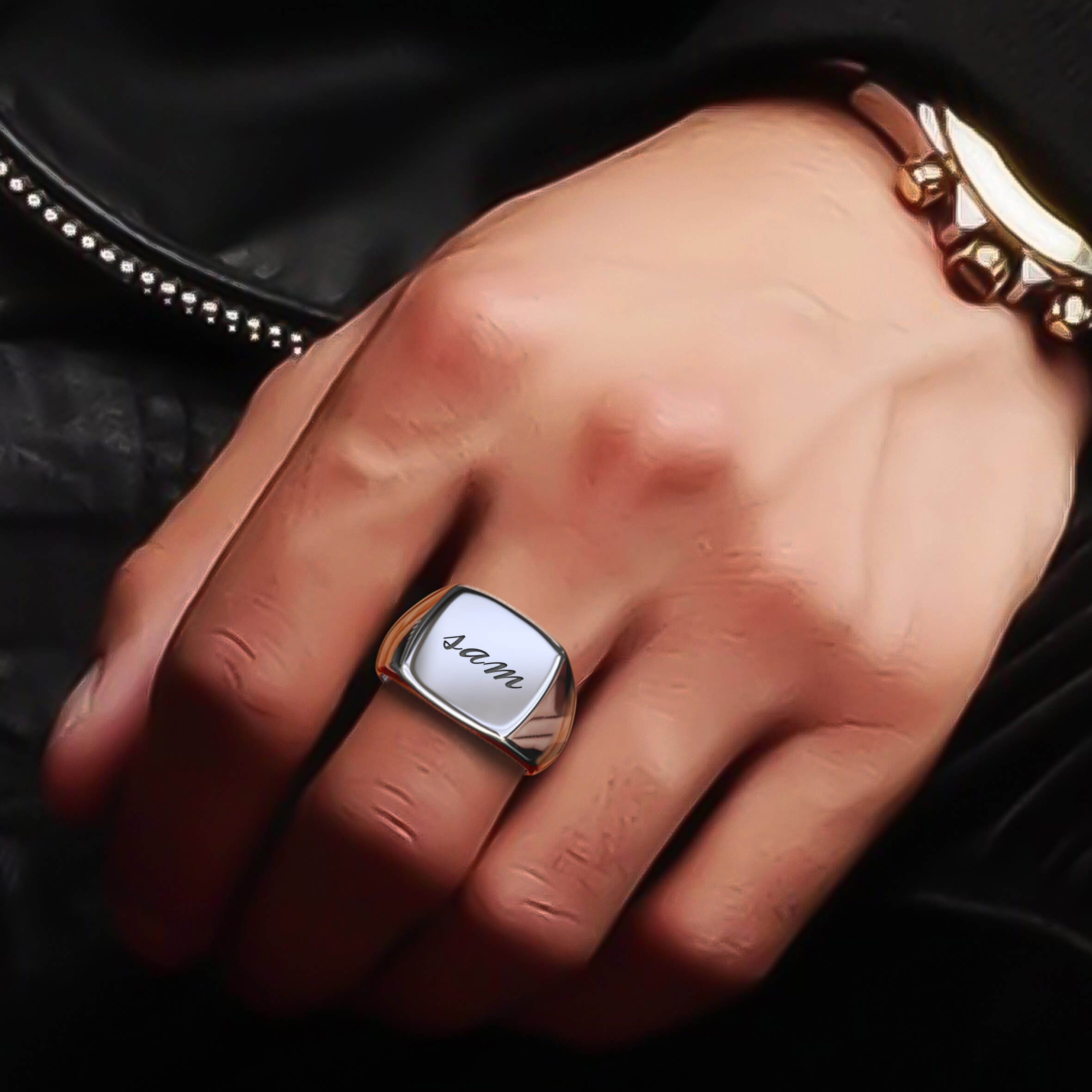 What sets this version apart is its customisable touch. Choose from three distinctive fonts to engrave your selected text in the center of the ring, making it a truly personal accessory. Whether it’s a name, a significant date, or a meaningful word, your choice adds a unique layer of significance to the ring's sophisticated design.