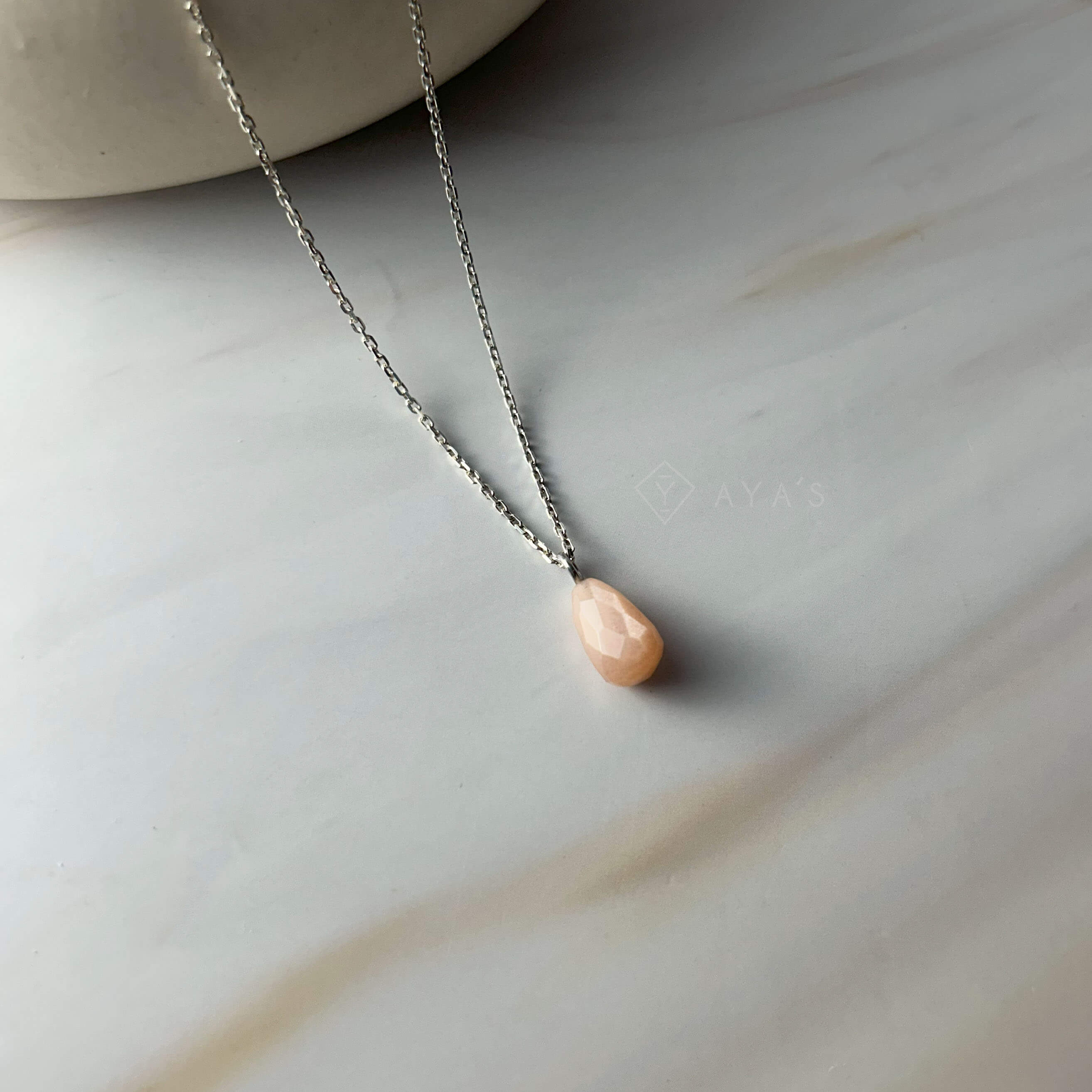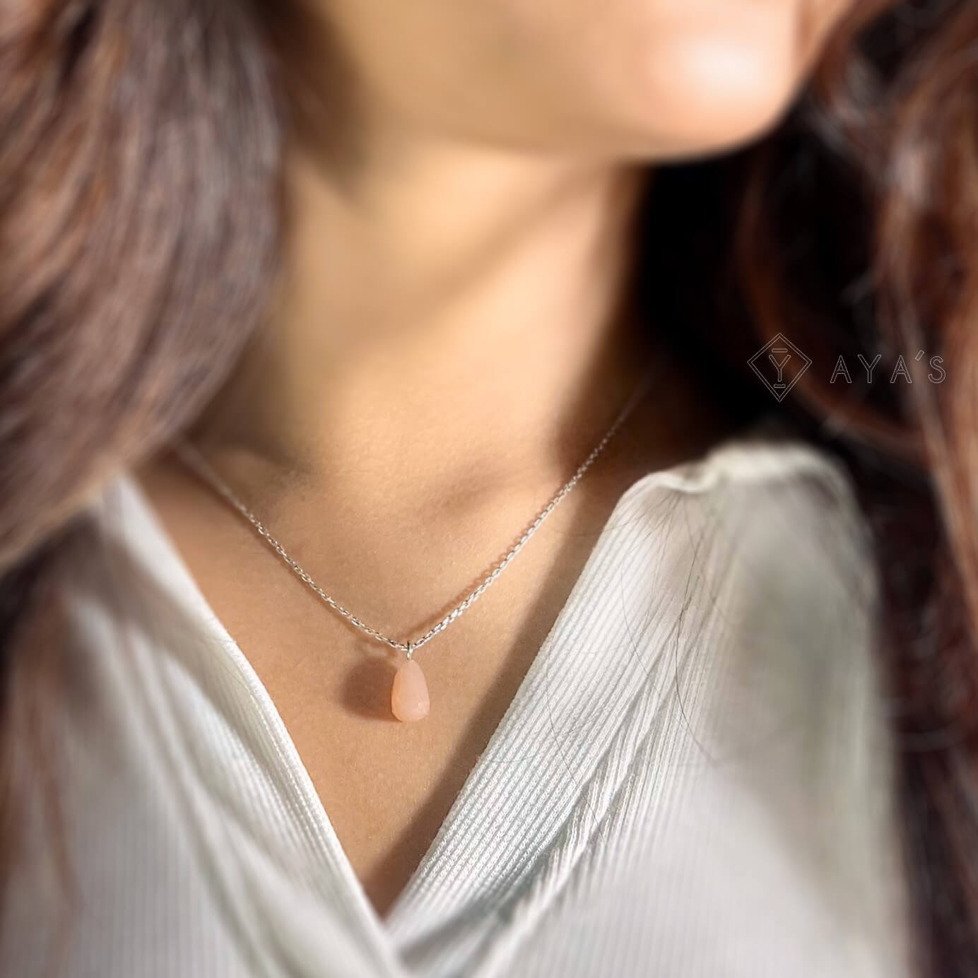 This pendant necklace features a GII certified tear drop shaped peach moonstone pendant, made with a natural gemstone and 925 silver chain. Bring elegance and uniqueness to your look with this precious, ethically-sourced piece.