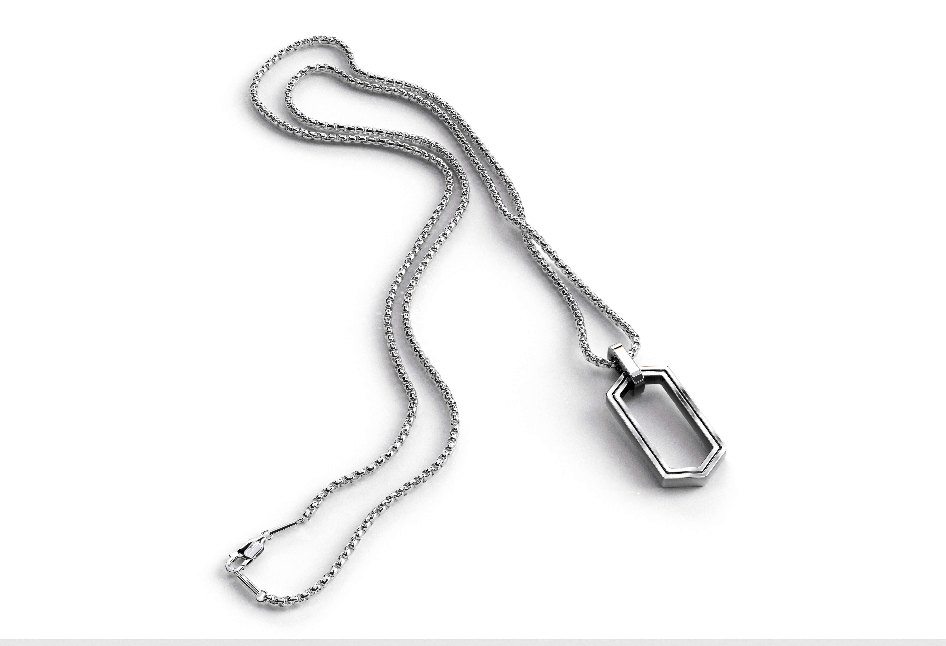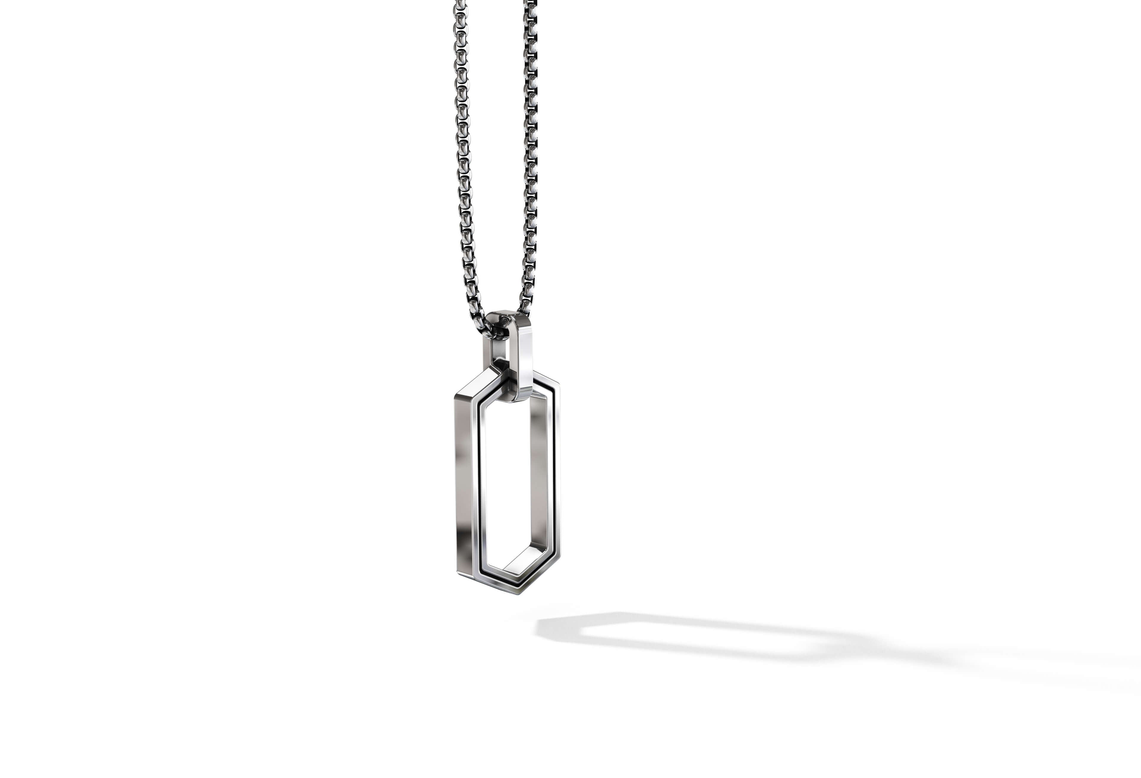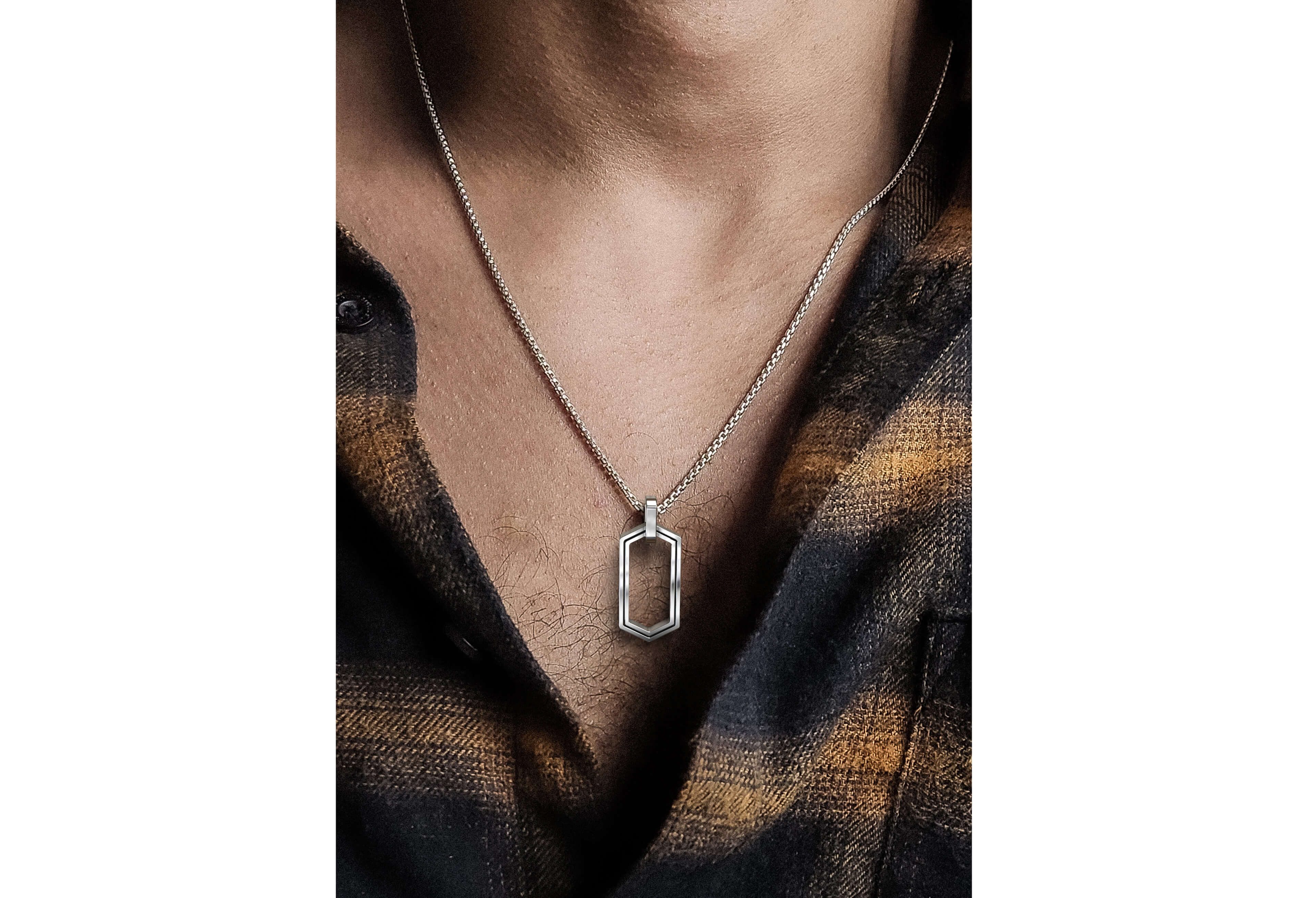 Versatile and sophisticated, the Flint Pendant can effortlessly elevate any ensemble, whether it's a casual daytime look or an evening affair. Pair it with the optional 2mm silver round box chain for a complete and polished finish.