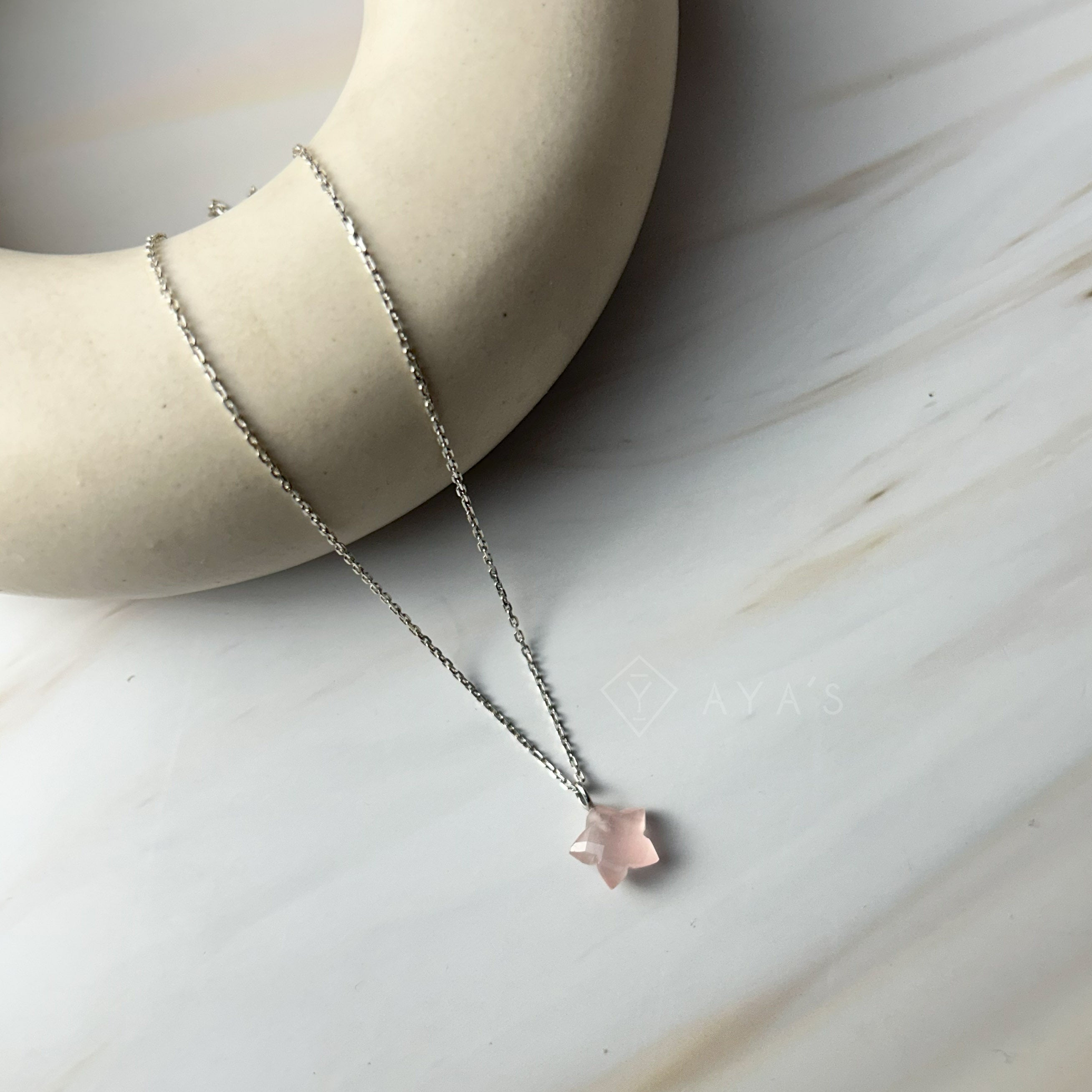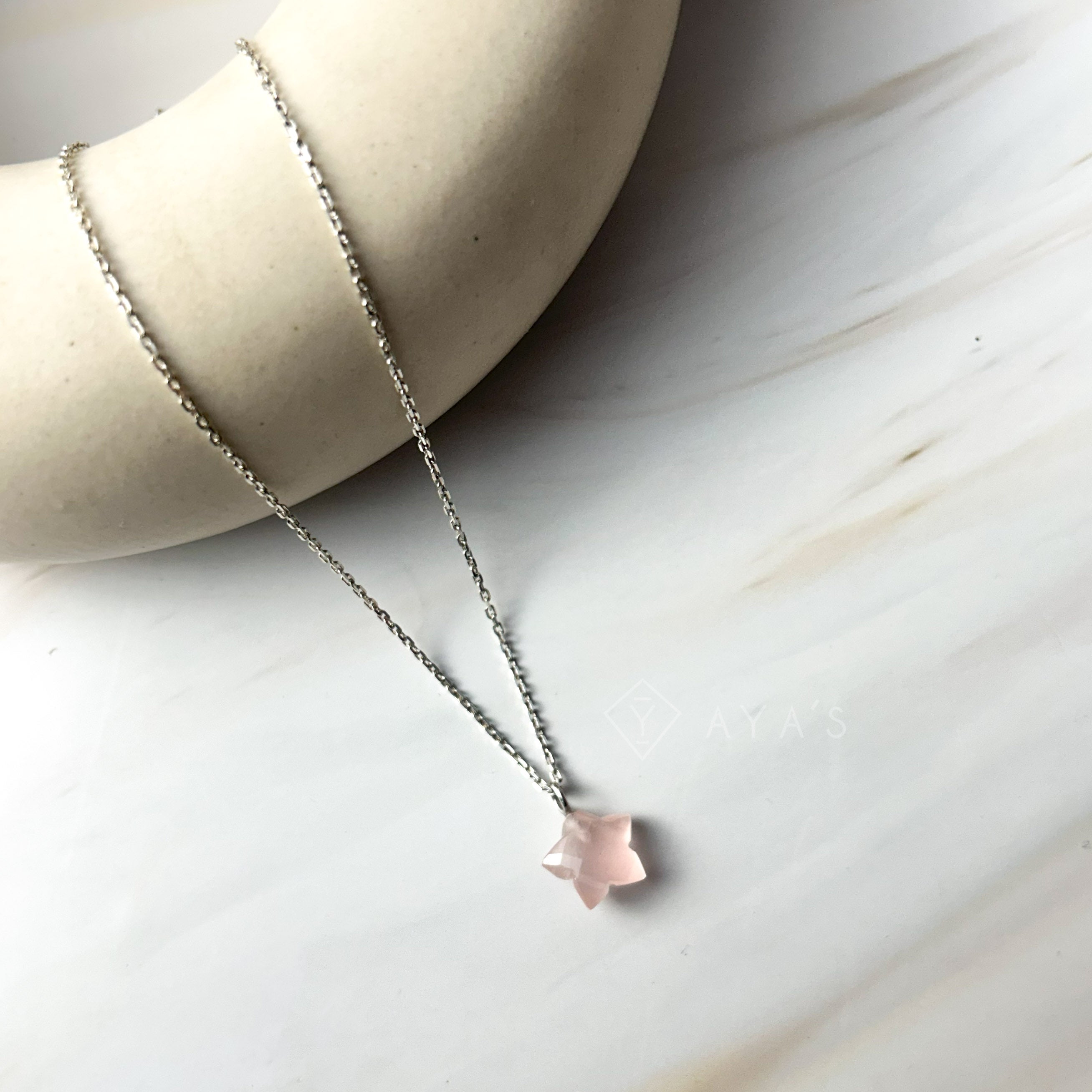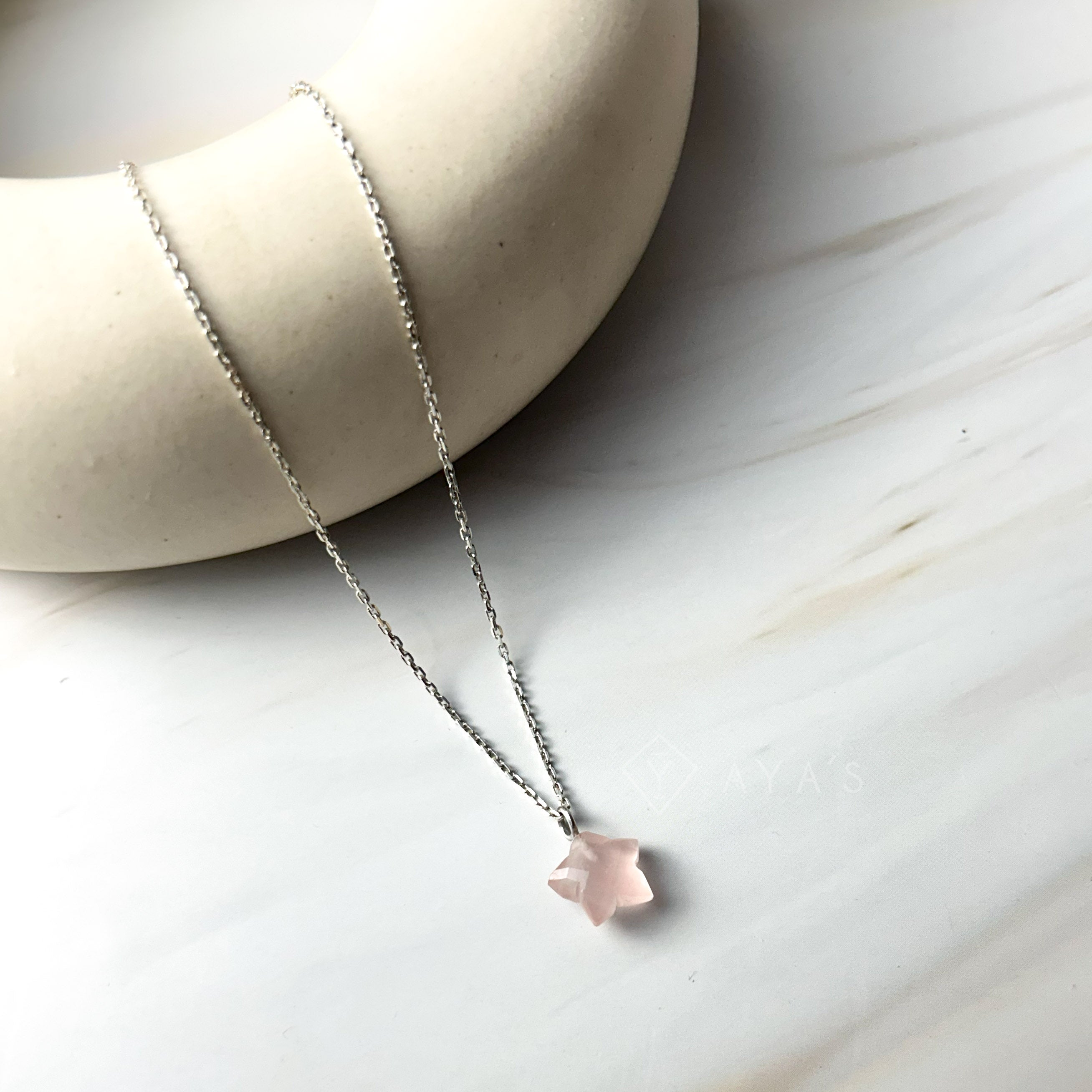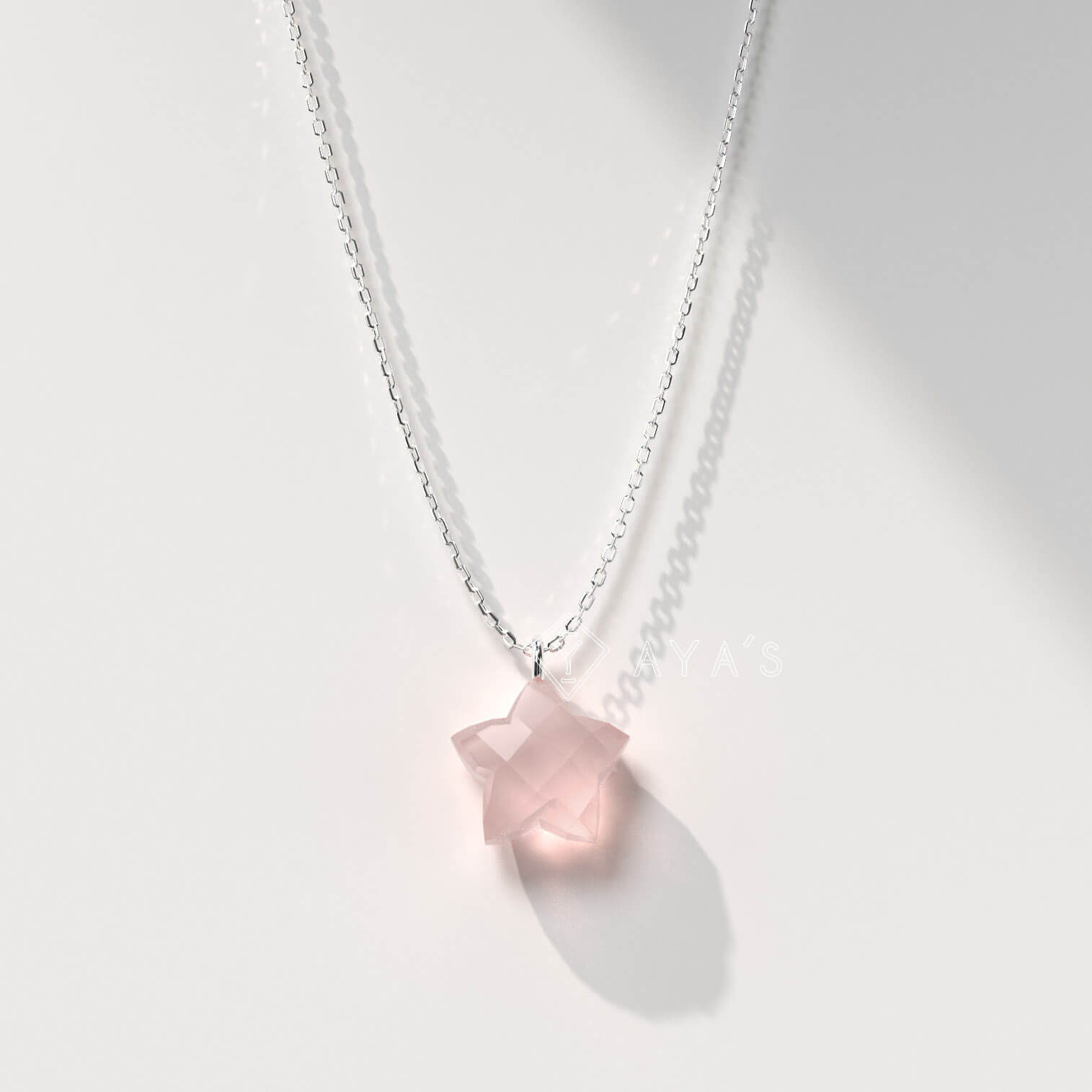 This elegant necklace features a GII certified star shaped natural rose quartz gemstone pendant on a 925 silver sterling chain. The gemstone is known for its calming and healing properties, making it the perfect addition to any outfit. Experience the beauty and benefits of natural gemstones with this necklace.