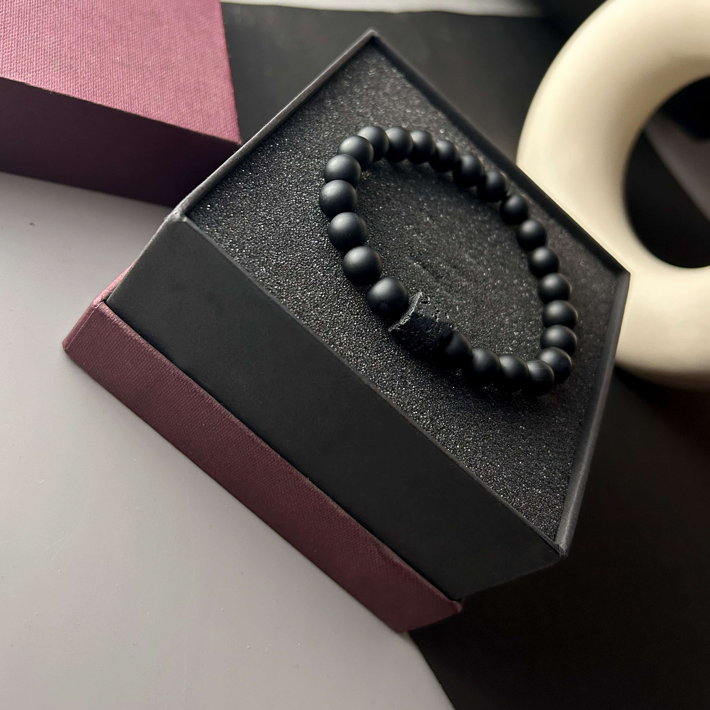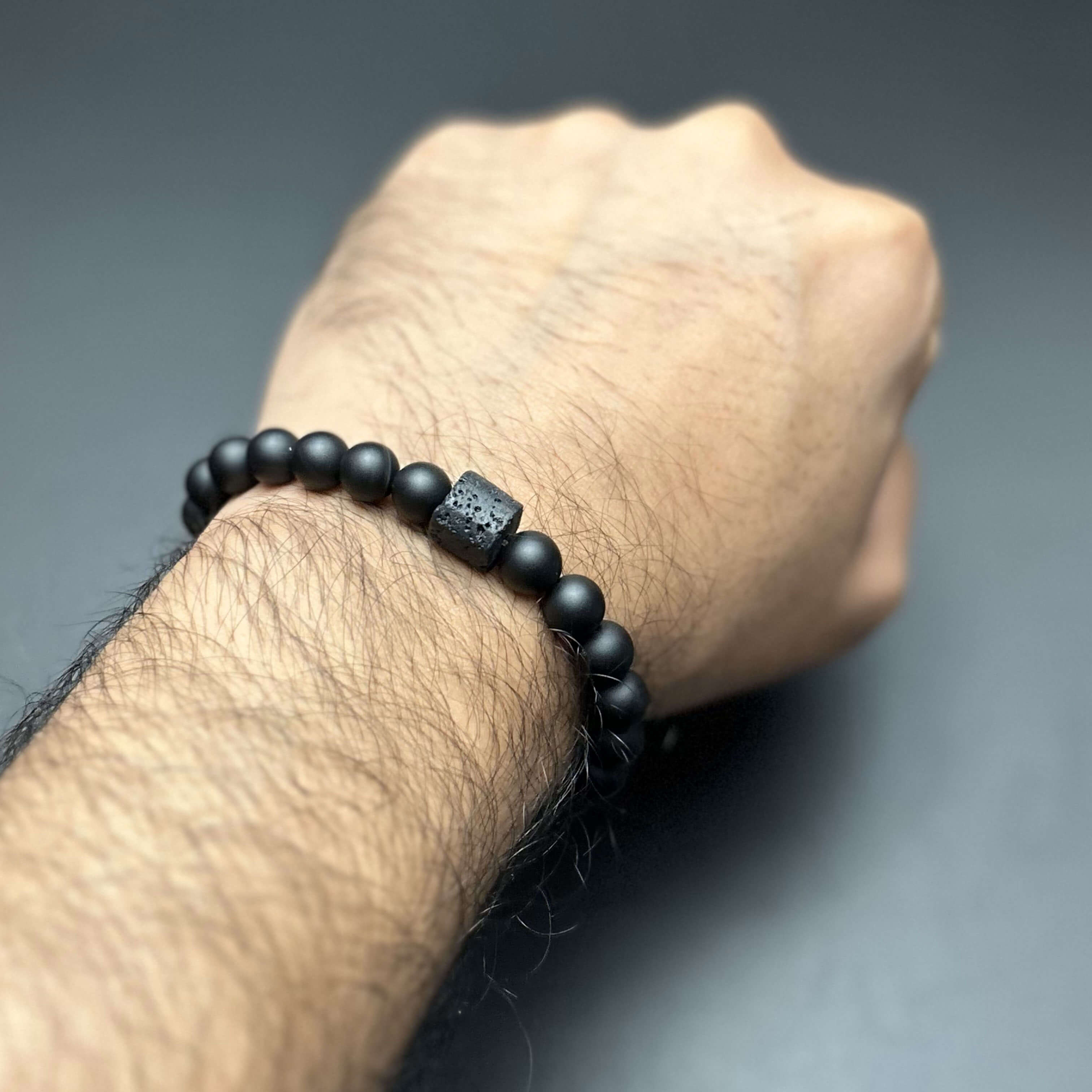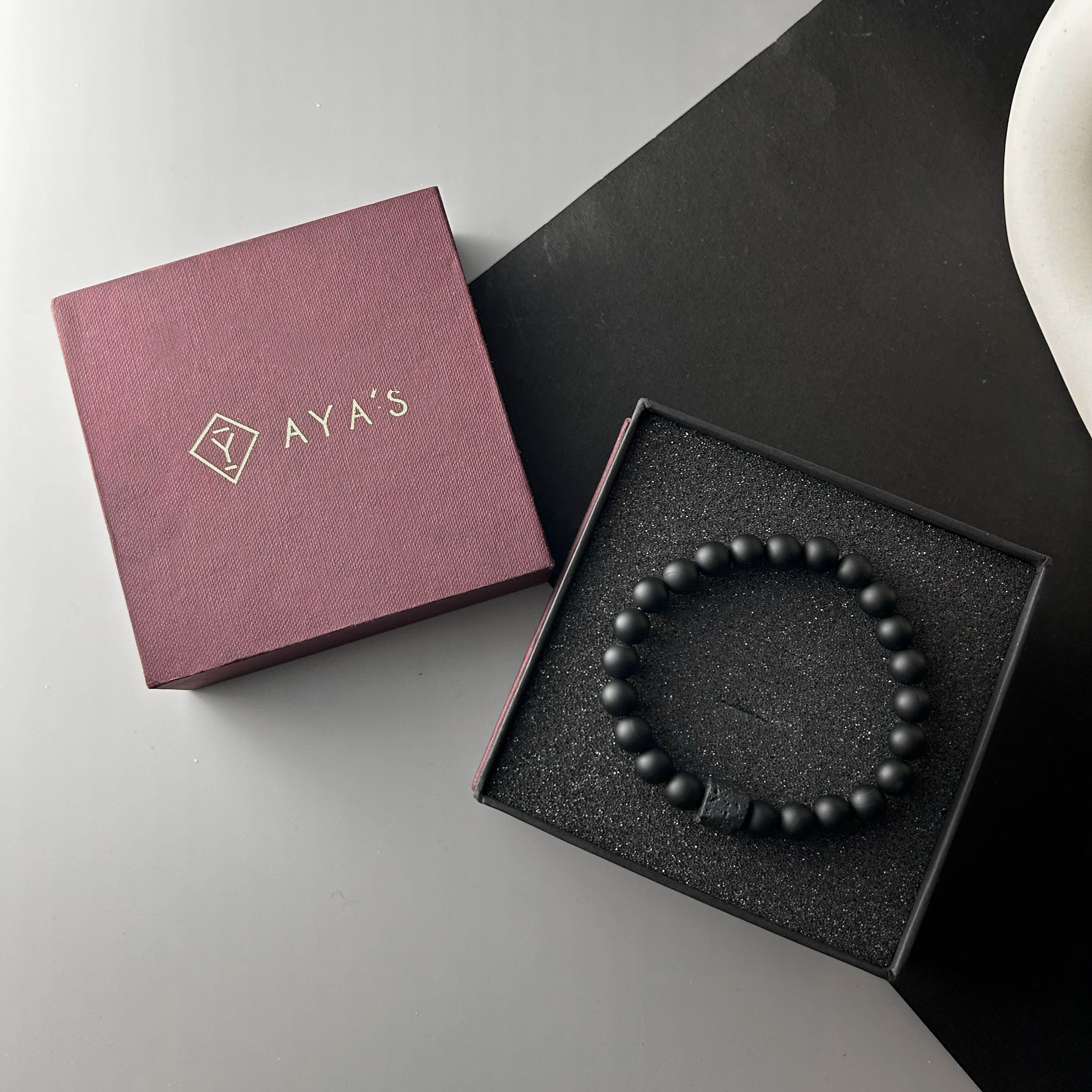This expertly crafted bracelet features a single strand of lava and black onyx matte natural stones. The combination of these powerful stones provides grounding and protection, making it a stylish and beneficial addition to any wardrobe.