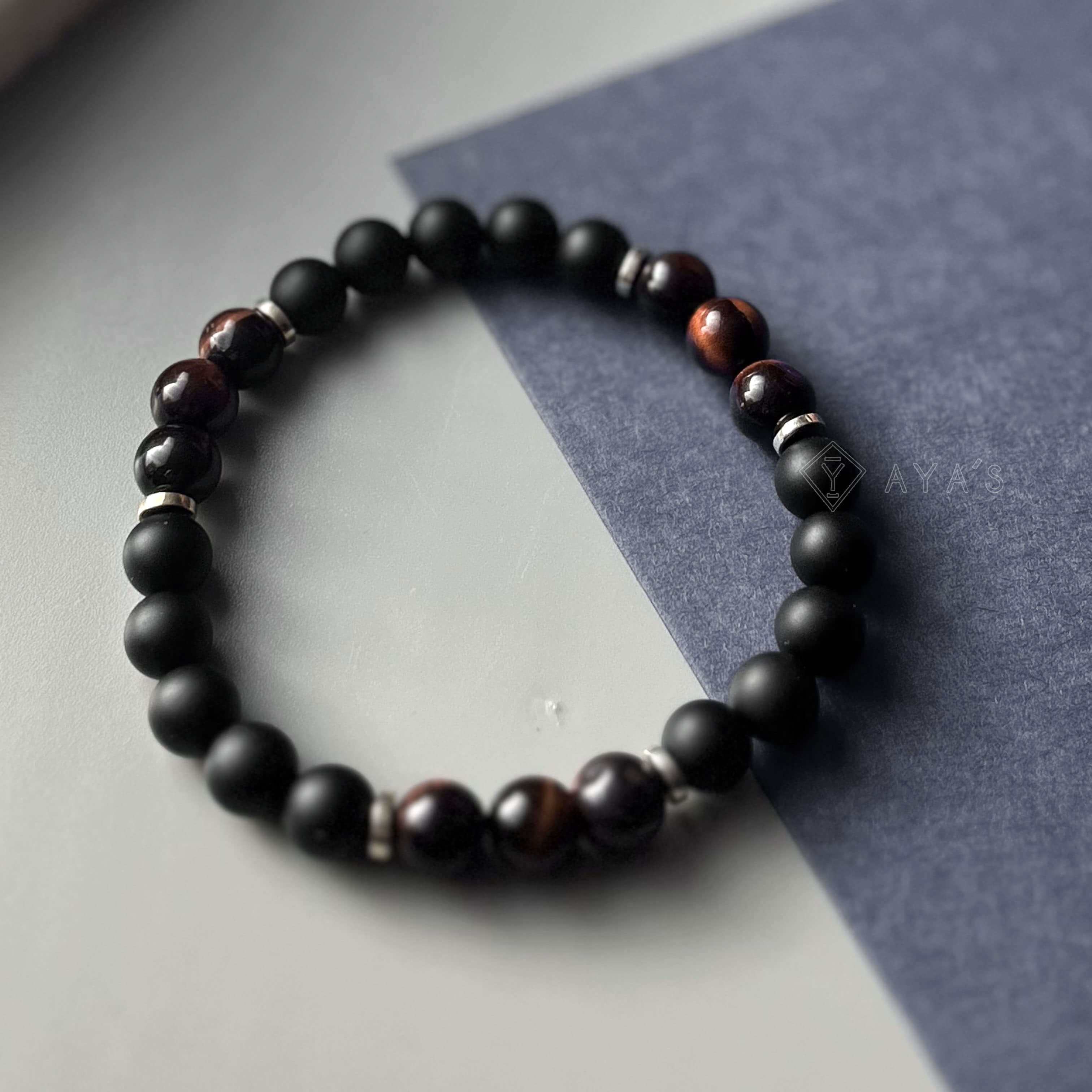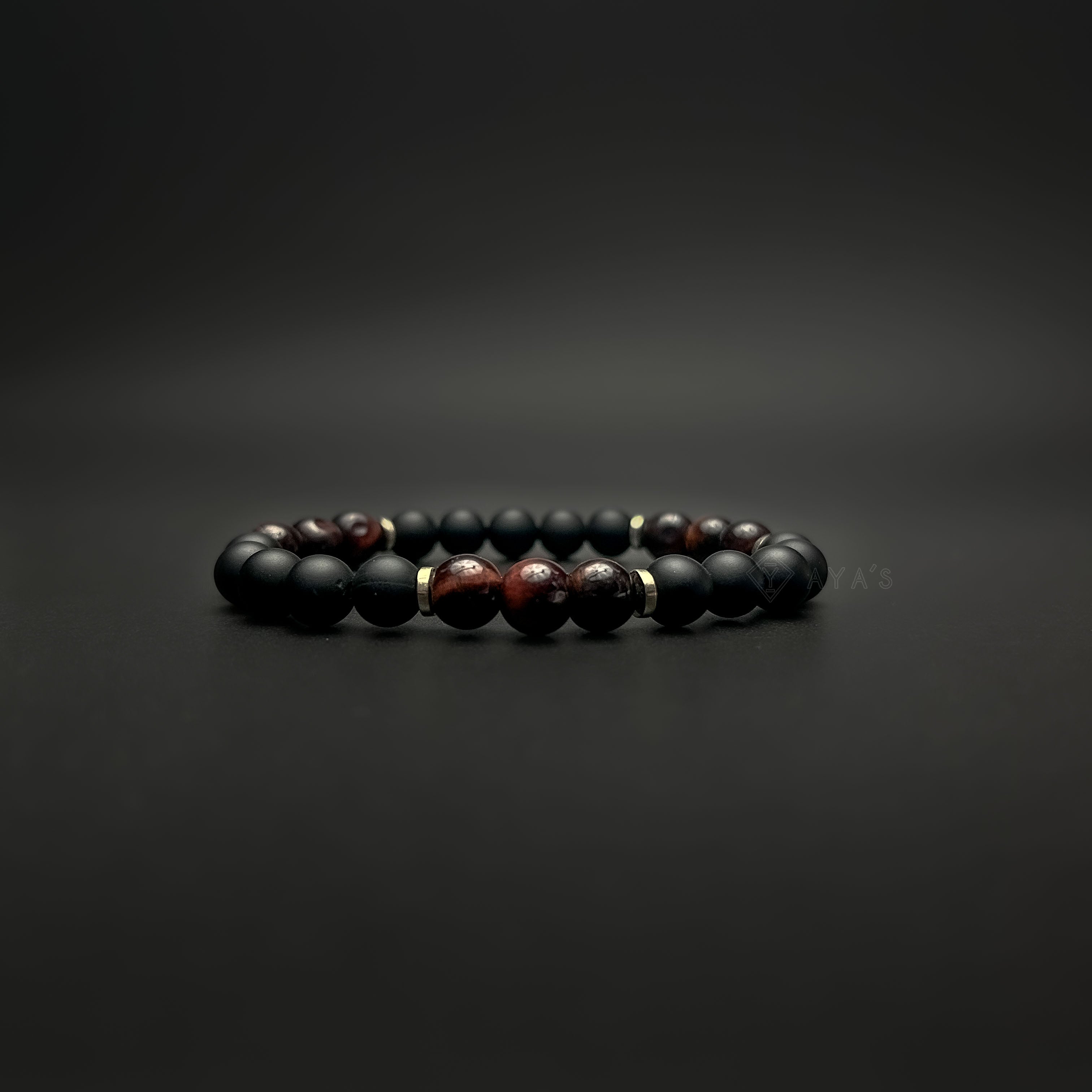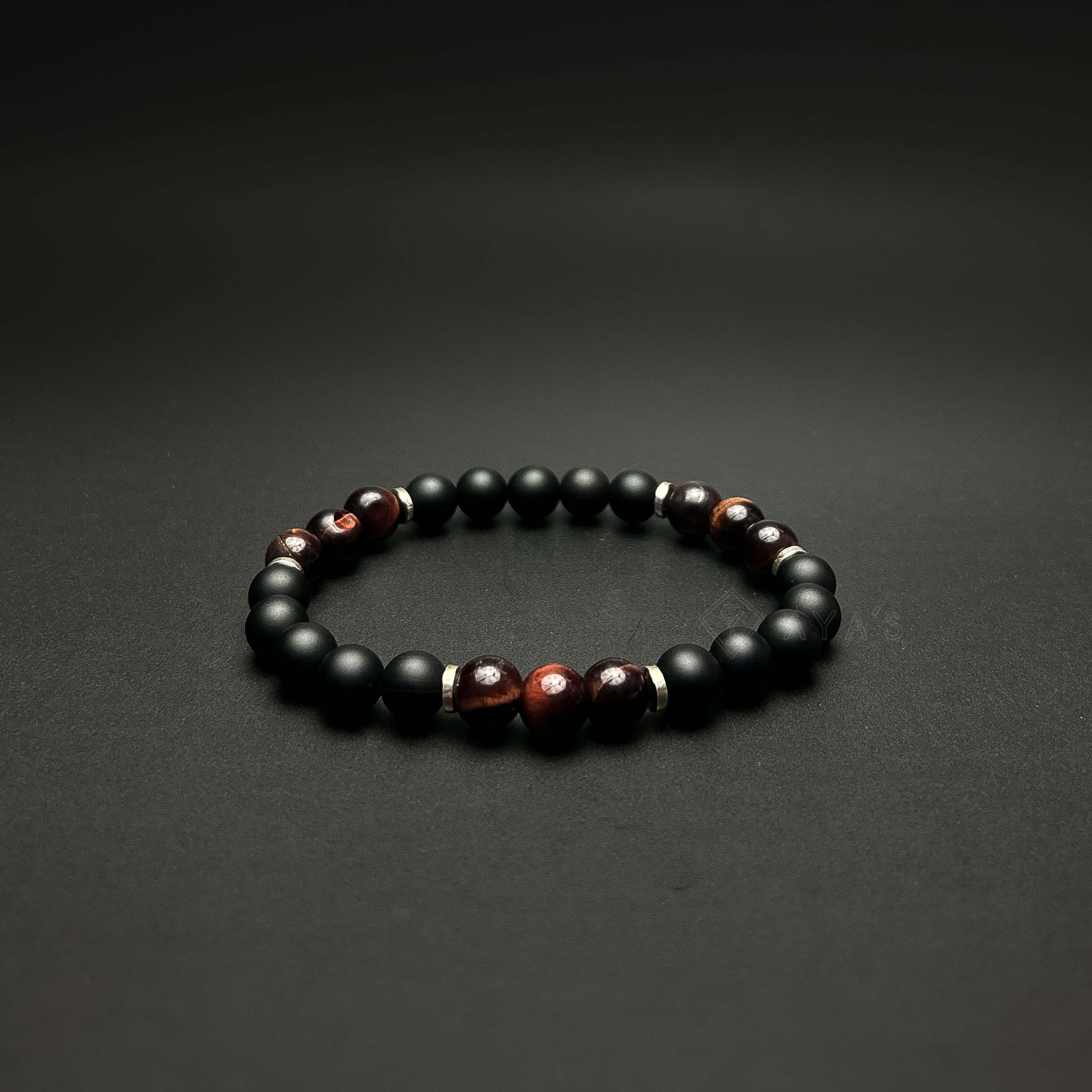 Tri Red Tiger Eye Triplet with Metallic End and Black Onyx Matte Natural Stone Bracelet