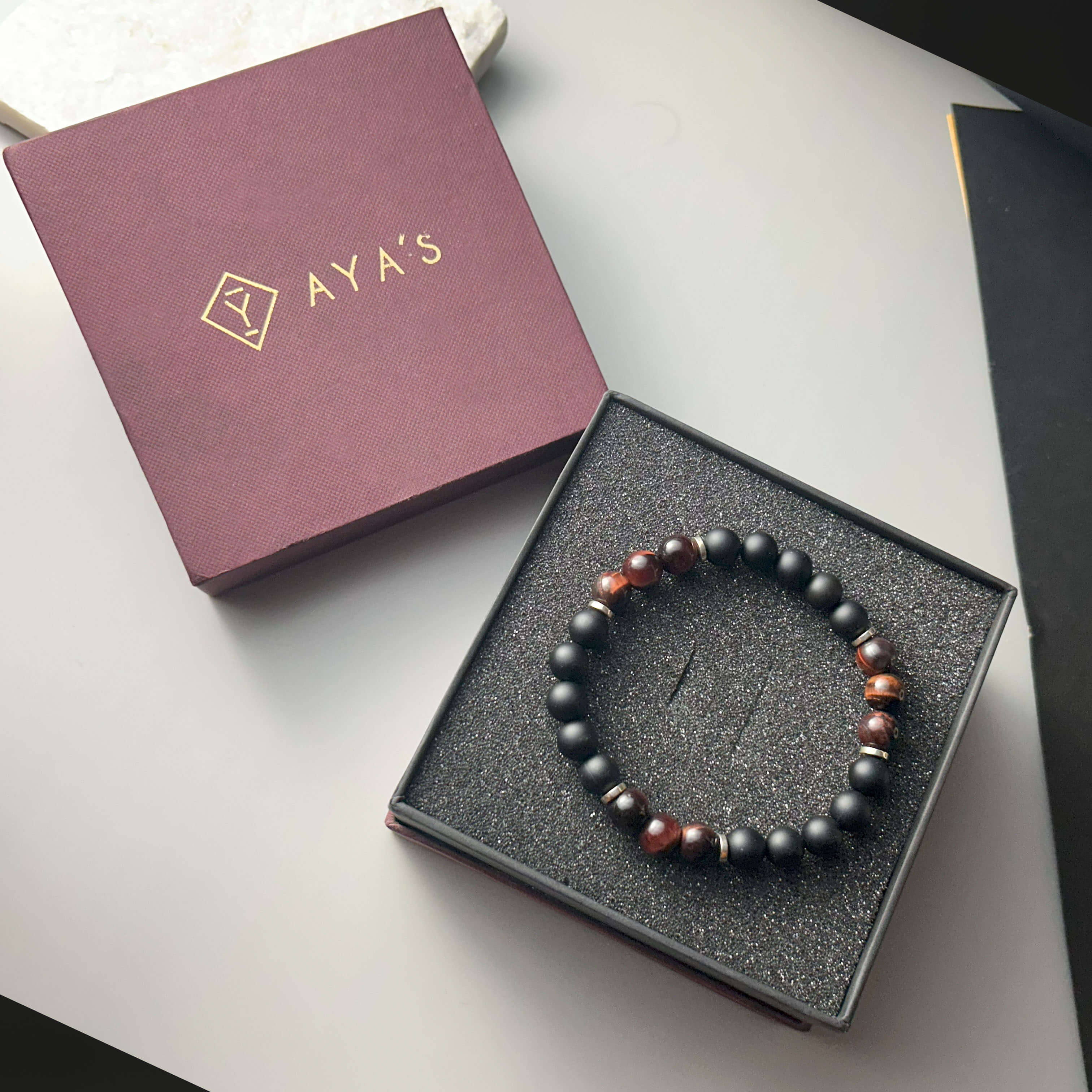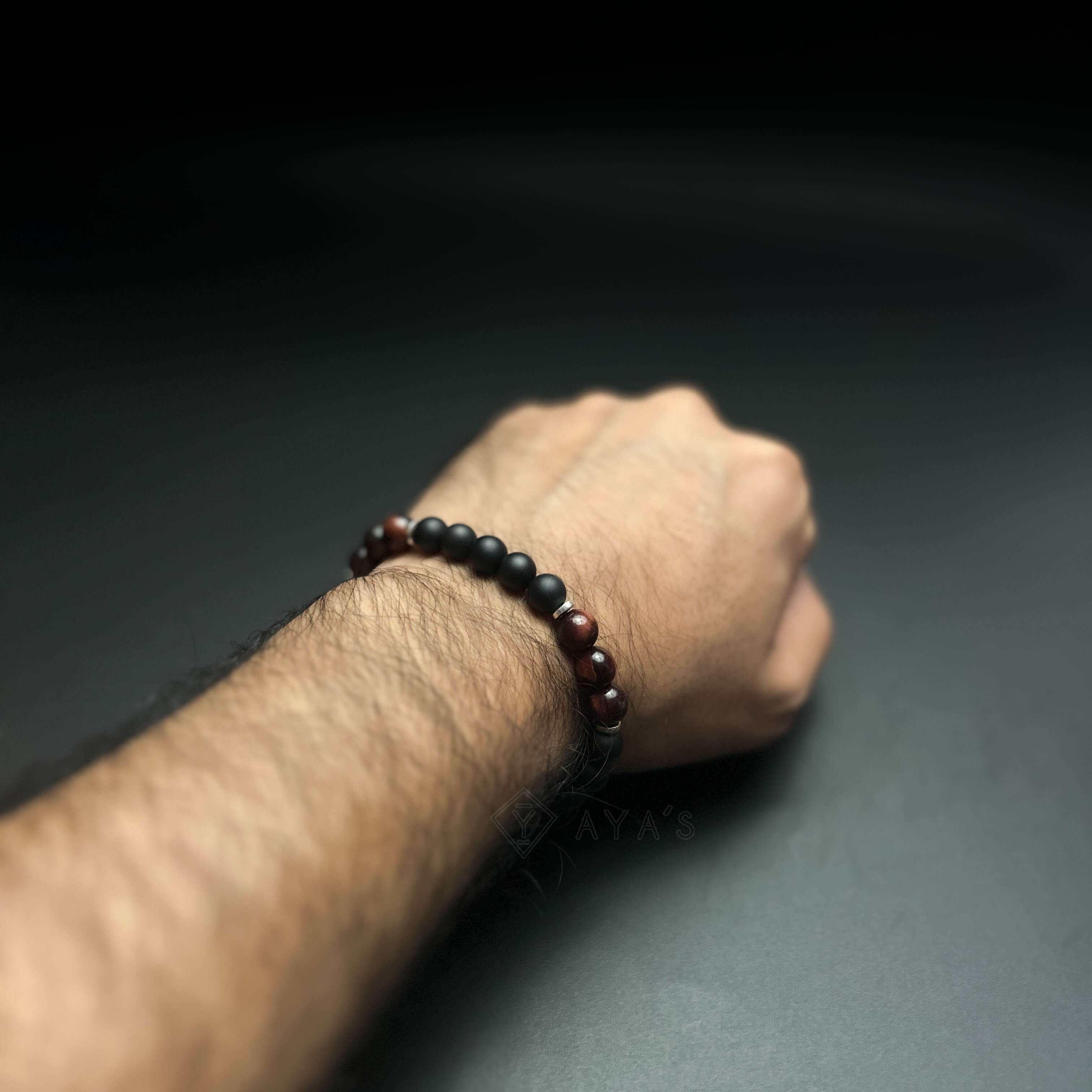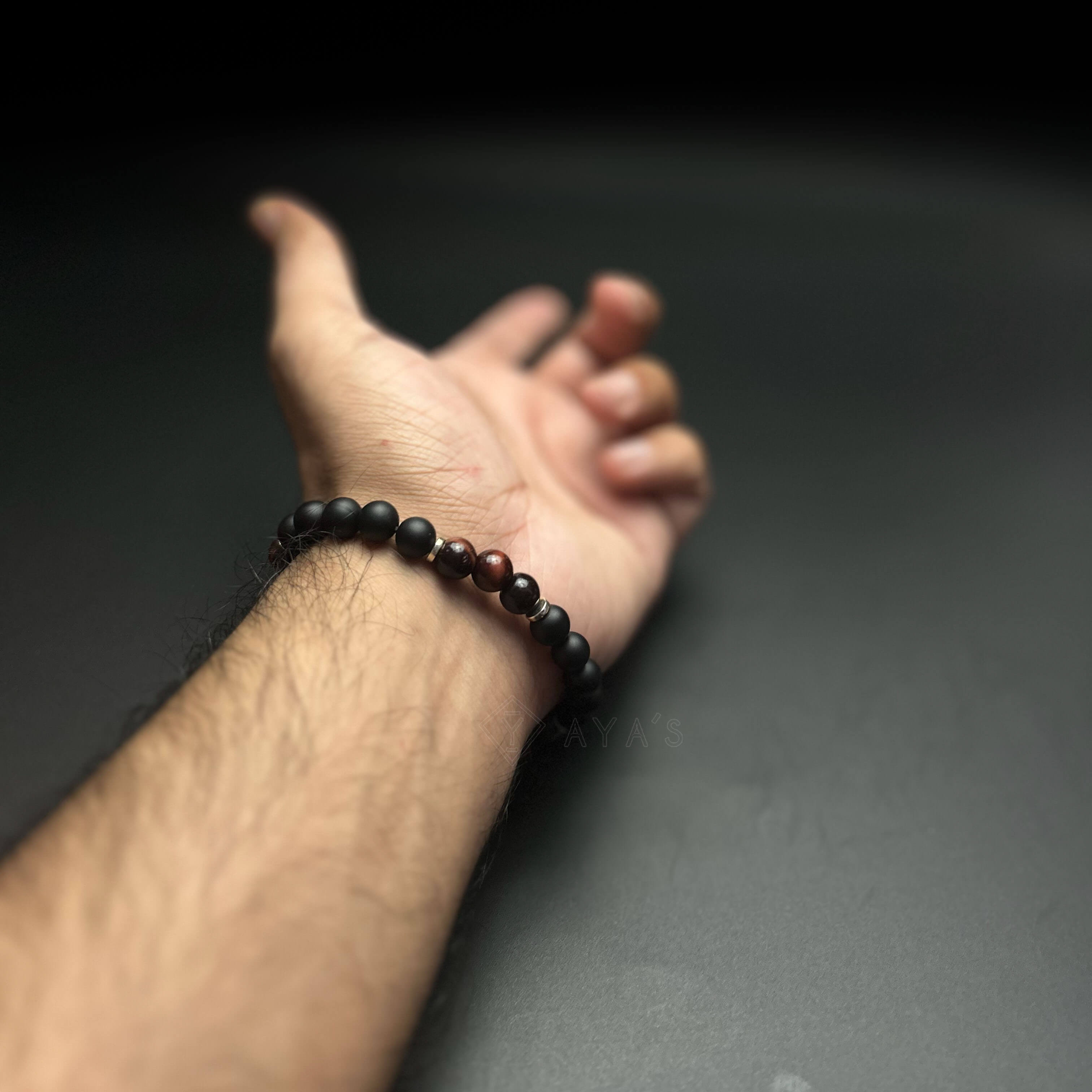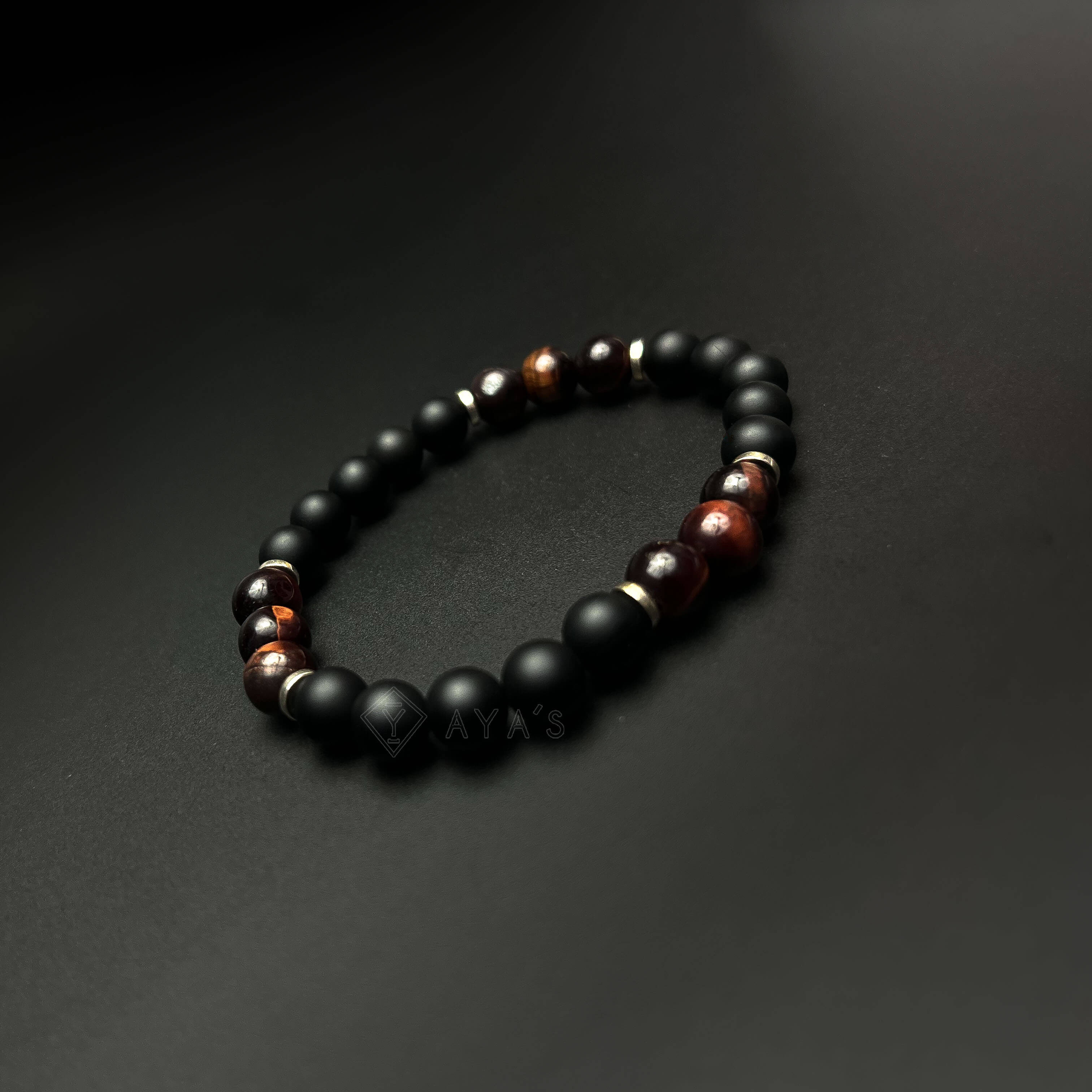 Tri Red Tiger Eye Triplet with Metallic End and Black Onyx Matte Natural Stone Bracelet