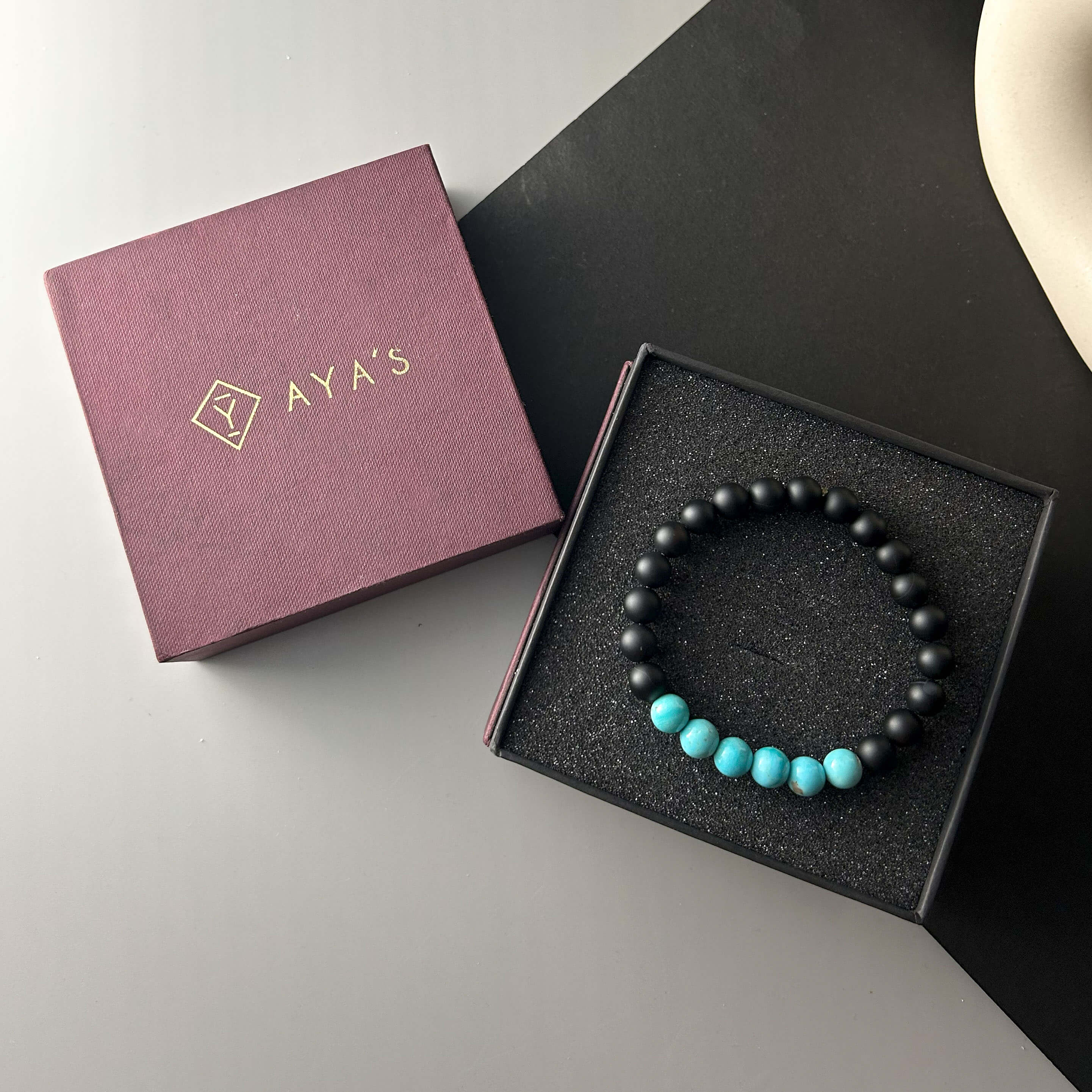 This unique bracelet features American Turquoise and Black Onyx stones, known for their beautiful natural colors and durability. The matte finish adds a touch of sophistication to any outfit, making it a versatile accessory for both casual and formal occasions.