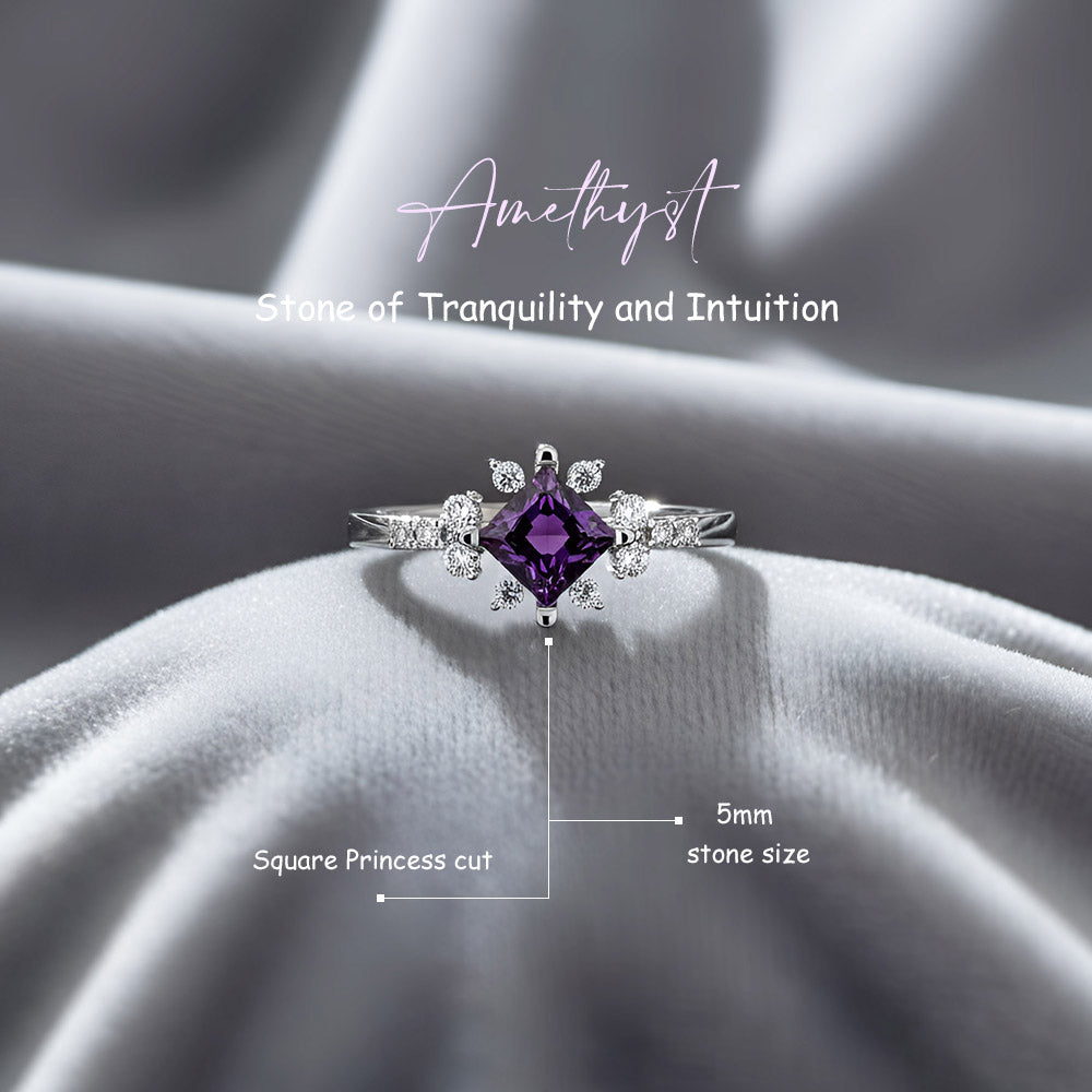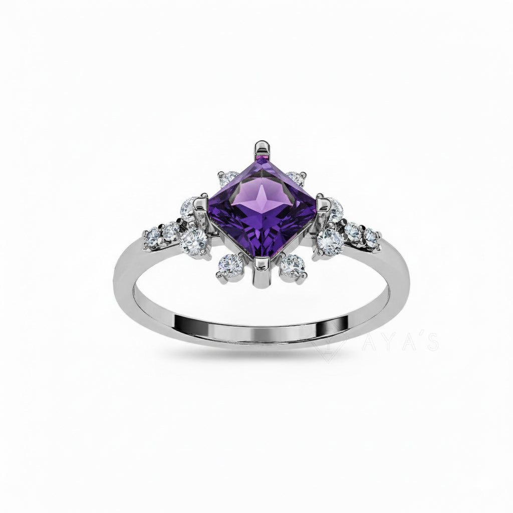 Add a touch of enchantment with the Silver Tresa Amethyst Natural Gemstone Solitaire Ring, showcasing a luminous princess-cut Amethyst at its heart. Surrounded by an elegant array of round and marquise-cut accents, this design evokes the magic of a starburst in full bloom — ideal for women who carry grace and mystique in equal measure.