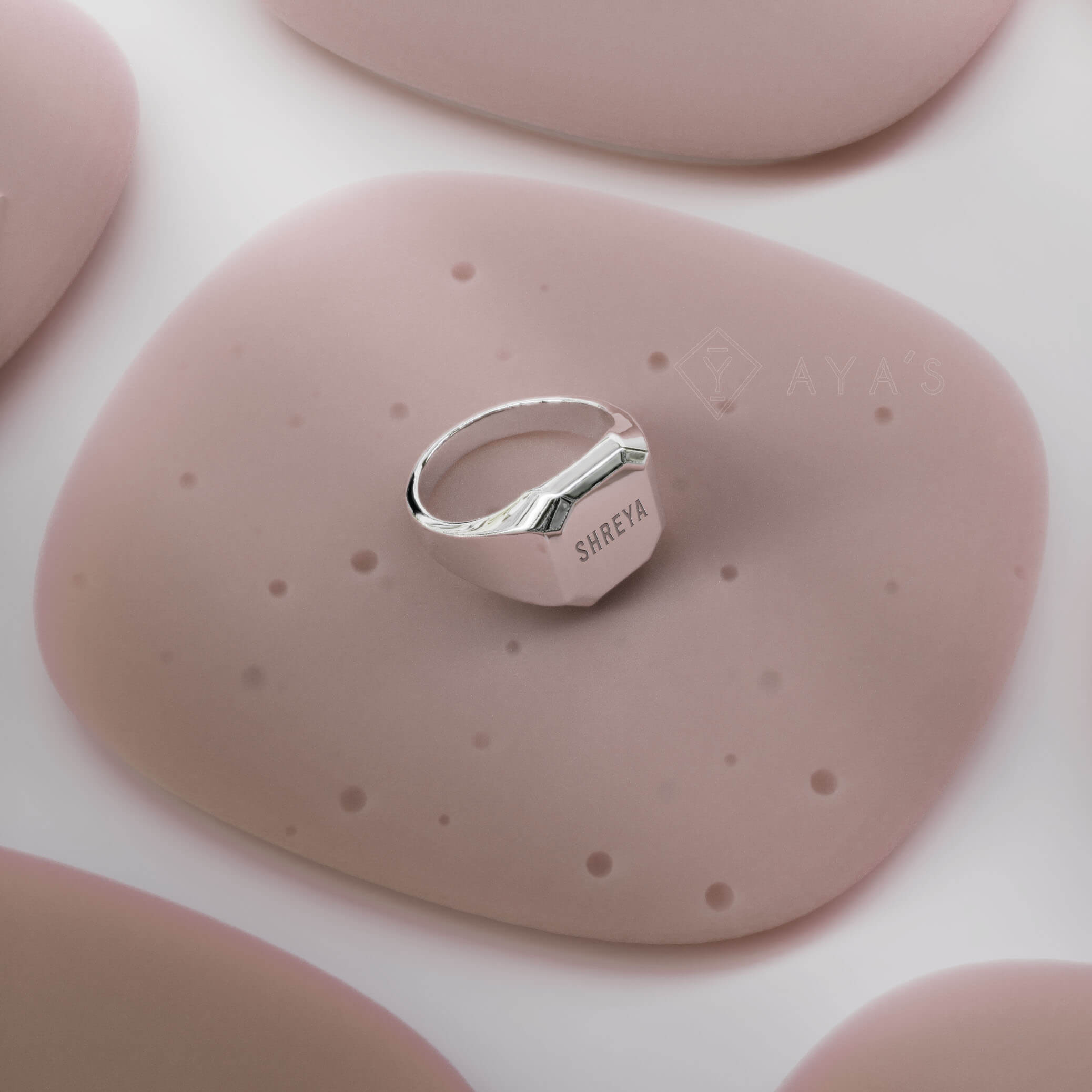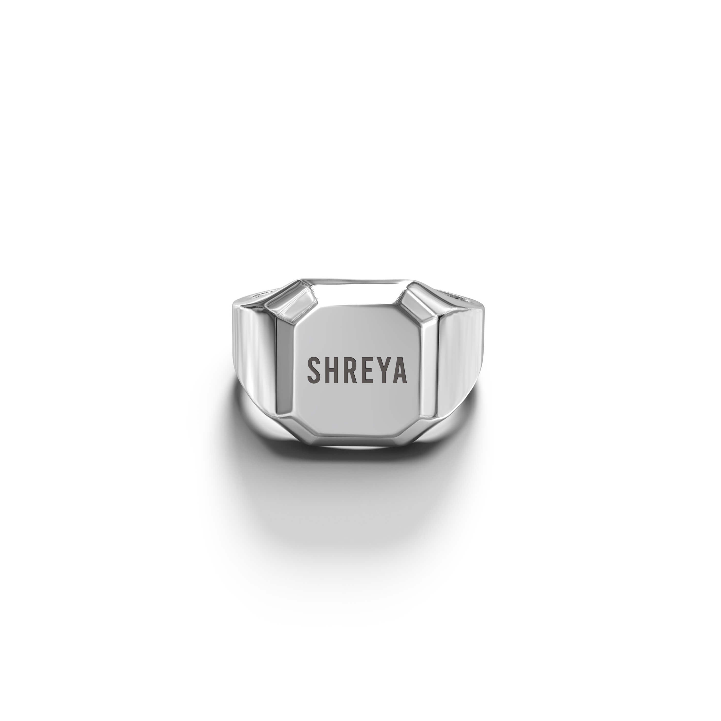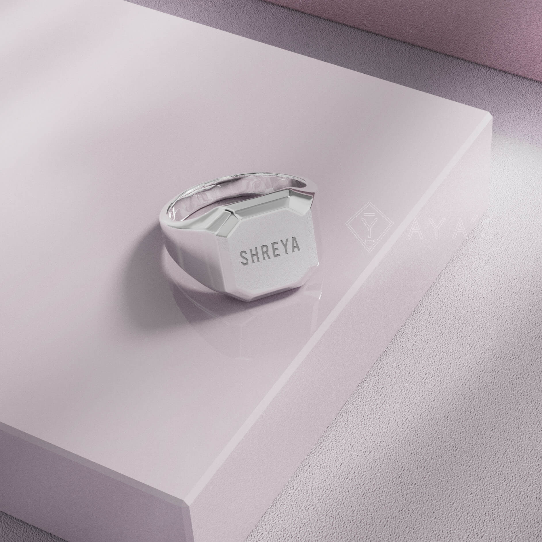 The Personalised Plain Eryx Women's Ring takes the sleek and modern design of the original Plain Eryx ring and adds a personal, meaningful touch. Crafted from high-quality 925 Sterling Silver, this ring features a distinctive octagonal-shaped plain collet that exudes contemporary elegance. The rhodium electroplating provides a durable, lustrous finish, while the glossy polish ensures a smooth, radiant surface that catches the light beautifully.